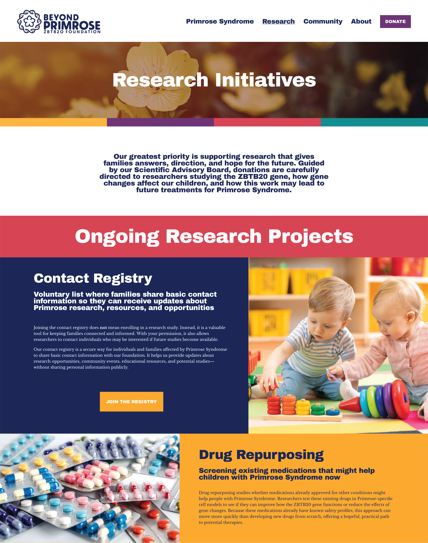 The goal of the Primrose website was to communicate the organization’s mission and vision through its design, while being welcoming and hopeful. The colors from the logo create visual separation between initiatives, as well as a warm, kid-friendly feel. The sharp corners and straight lines elevate the design and underline the organization’s professionalism. Altogether, these elements create a friendly, professional visual system that reinforces brand identity and supports clear, empathetic communication.